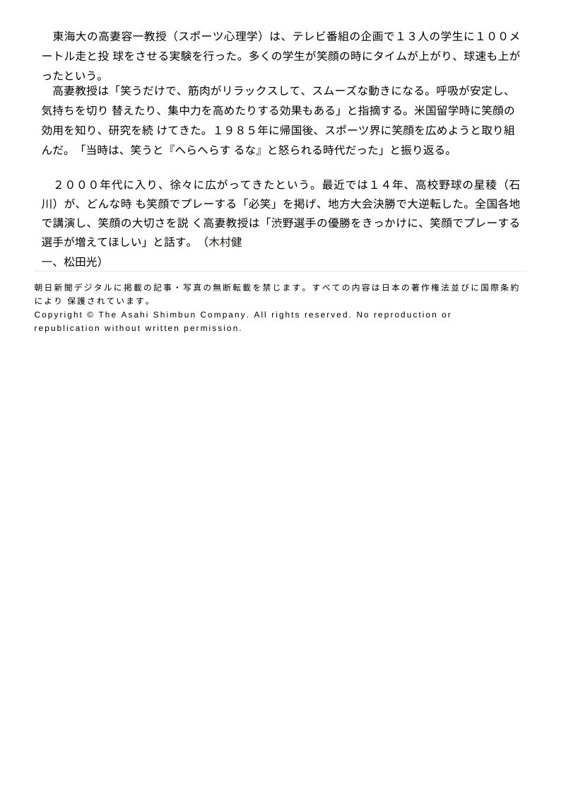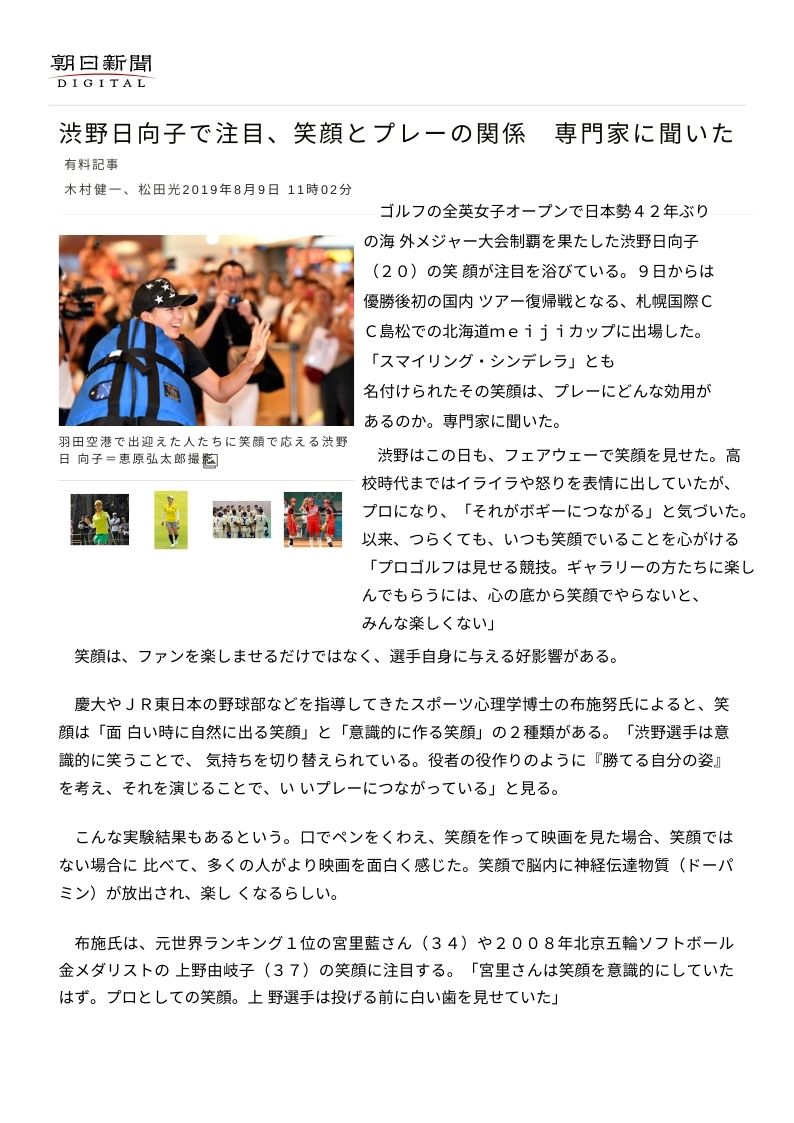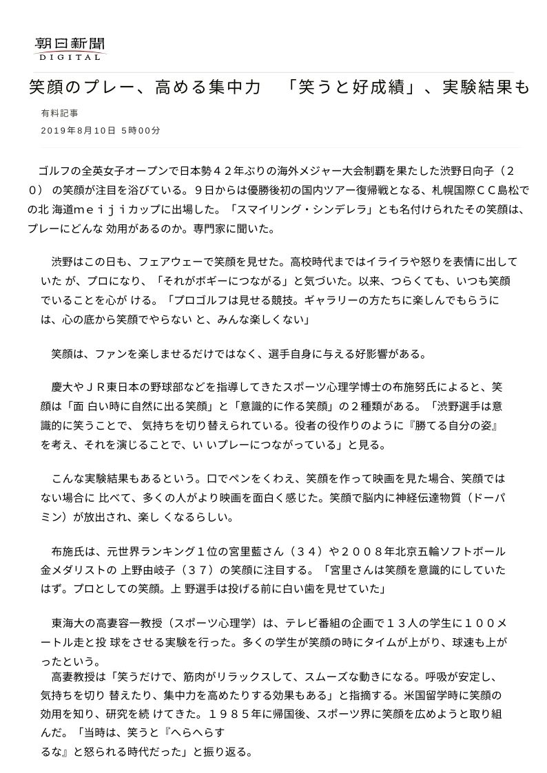【メディア】渋野日向子で注目、笑顔とプレーの関係 専門家に聞いた(朝日新聞)北浦 舞2019年8月9日読了時間: 1分更新日:2023年1月30日ゴルフの全英女子オープンで日本勢42年ぶりの海 外メジャー大会制覇を果たした渋野日向子で注目されている笑顔とプレーの関係について語っています。*2019年8月9日記事*2019年8月10日記事
